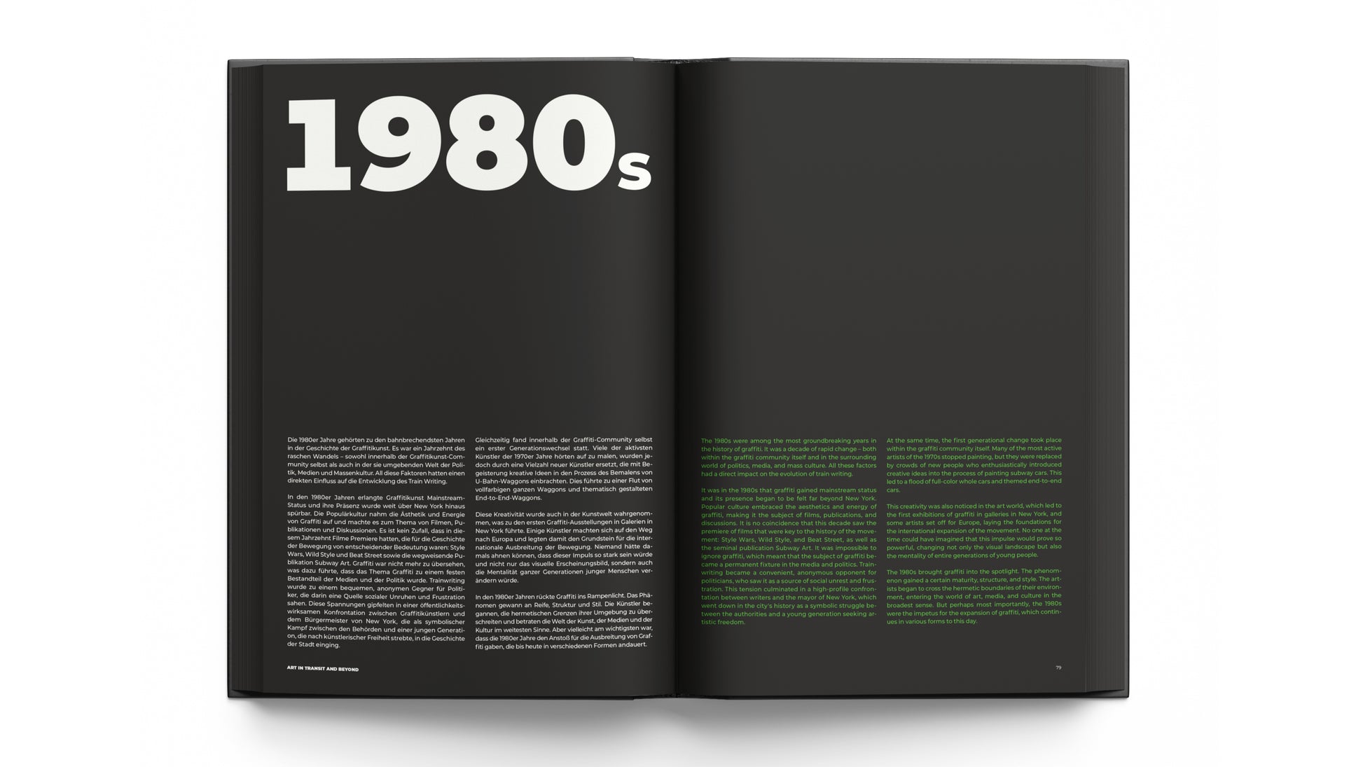 The publication mirrors the original structure of the double exhibition: It opens with the HALLENKUNST Timeline "From New York To Europe," tracing the journey of graffiti on trains from its 1970s roots in NYC to its digital evolution today. The second half presents the Group Exhibition, featuring positions by over 40 international artists and collectives who demonstrate how a subculture has transformed into a leading force within contemporary art.
